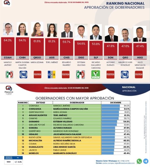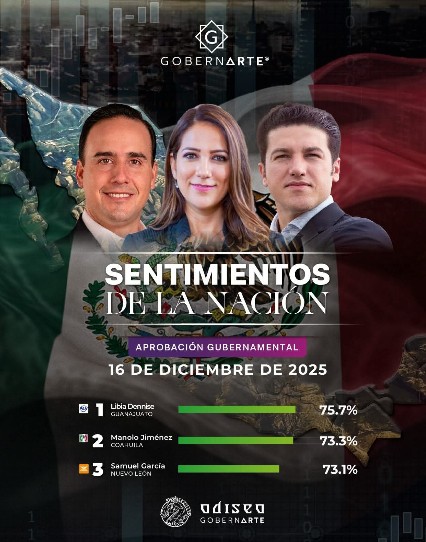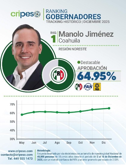 Además, en los resultados publicados por la casa encuestadora GobernArte, el gobernador de Coahuila, Manolo Jiménez Salinas, se ubica en la segunda posición a nivel nacional en el índice de aprobación gubernamental.