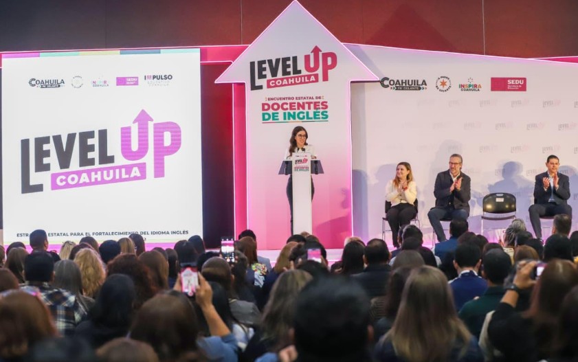 Saltillo, Coahuila.- Como parte del programa integral Level Up, el Gobierno del Estado, a través de la Oficina Inspira Coahuila, y en coordinación con la Secretaría de Educación, llevaron a cabo el Encuentro Estatal de Docentes de Inglés, en el cual participaron más de 500 maestras y maestros de todas las regiones y de los diferentes niveles educativos, desde primaria, hasta universidad.