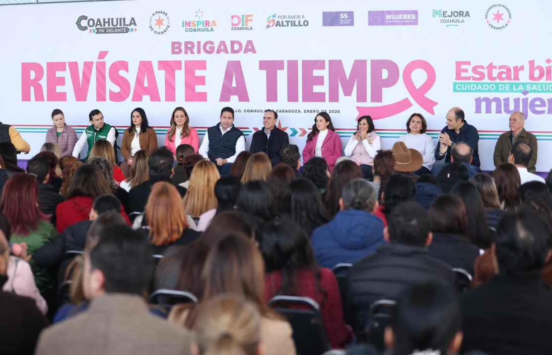 «En Coahuila seguimos fortaleciendo la salud de nuestras mujeres. Por ello, junto a mi esposa Paola y a nuestros equipos de Inspira y Salud, durante todo el 2026, en especial los días 19, vamos a estar llevando a cabo diferentes actividades del programa “Revísate a Tiempo”, para atender y concientizar con mayor intensidad la prevención de cáncer de mama y cervicouterino. Hoy 19 de enero arrancamos las brigadas “Estar bien” con servicios de mastografía, papanicolaou y atención médica para la detección oportuna del cáncer. Estas brigadas se extenderán a los 38 municipios del estado», destacó el gobernador.