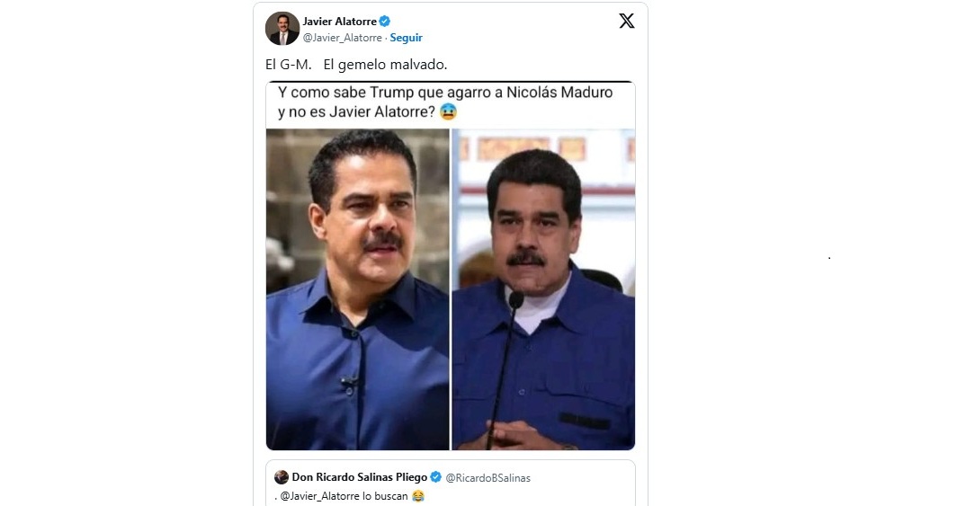 «¿Y cómo sabe Trump que agarró a Nicolás Maduro y no es Javier Alatorre», se leyó en un meme que circuló en redes sociales y que fue compartido en X por el propio presentador del noticiero Hechos. De hecho, no solo lo replicó sino que además pareció reaccionar con humor a las similitudes: «El G-M. El gemelo malvado», escribió.
