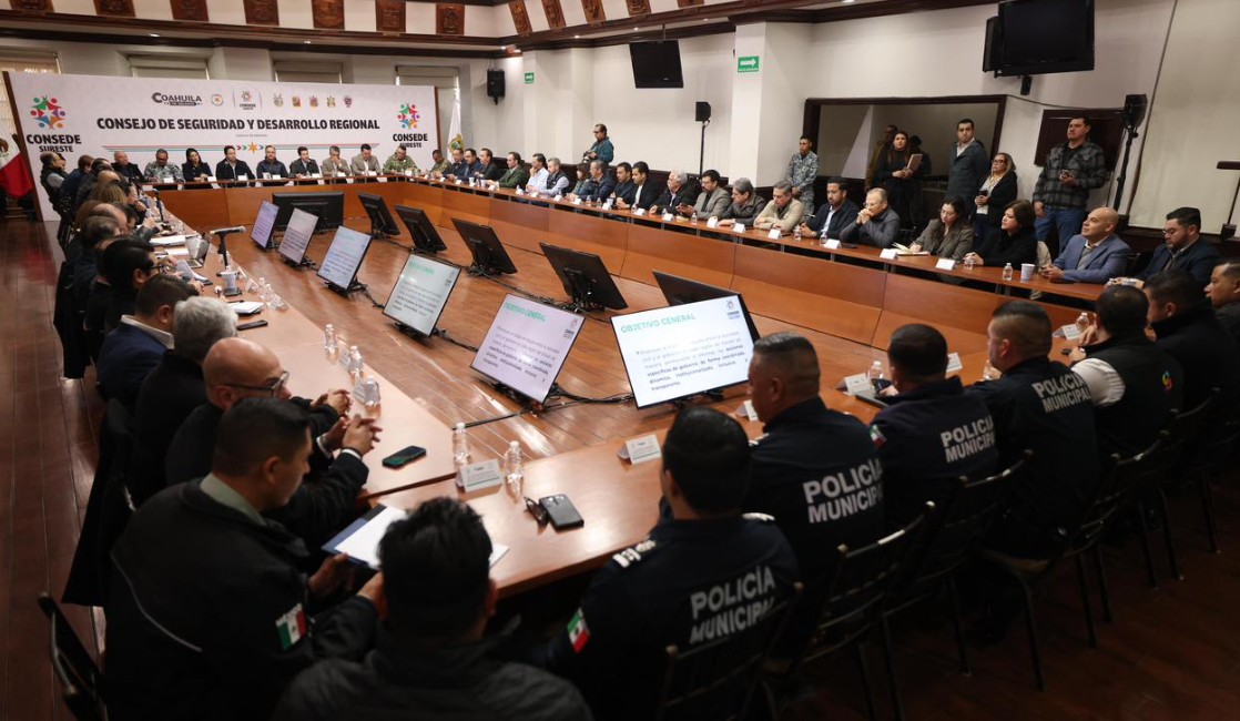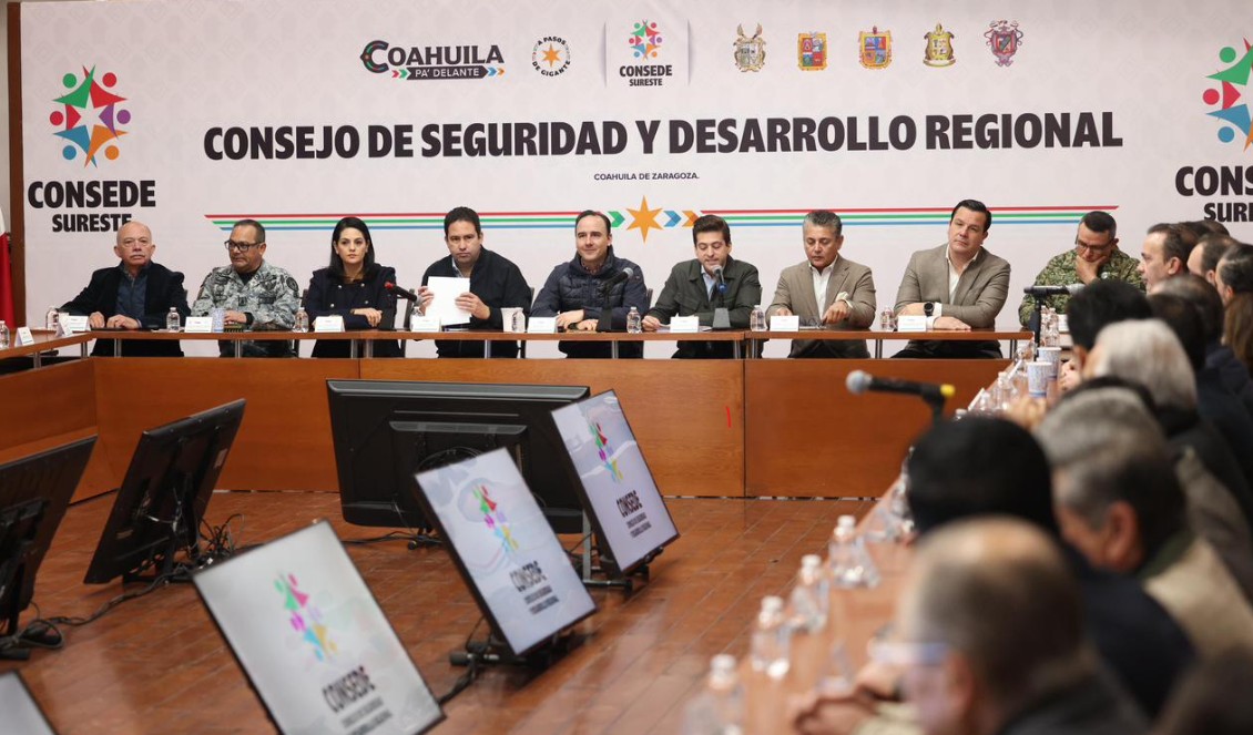 Saltillo, Coahuila.- El gobernador Manolo Jiménez Salinas presidió la reunión del Consejo de Seguridad y Desarrollo Regional Sureste, en la que se presentaron avances del fortalecimiento de la economía y del empleo 2025-2026, así como los indicadores en seguridad y los avances en las obras de infraestructura sostenible.