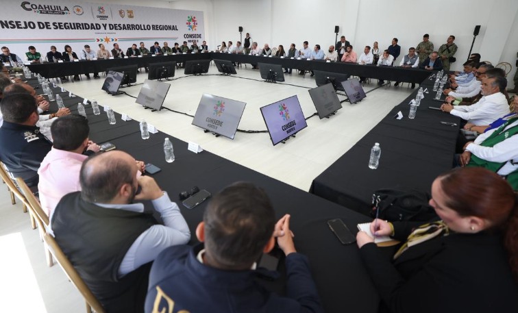 Ciudad Acuña, Coahuila.- Al encabezar la reunión del Consejo de Seguridad y Desarrollo Regional en Acuña, el gobernador Manolo Jiménez Salinas dio a conocer que ha mantenido este tipo de encuentros en todas las regiones del estado para revisar, junto con miembros de la iniciativa privada, la sociedad civil, representantes de las fuerzas de seguridad y alcaldes y alcaldesas, los indicadores de orden y seguridad, Coahuila global e infraestructura sostenible.