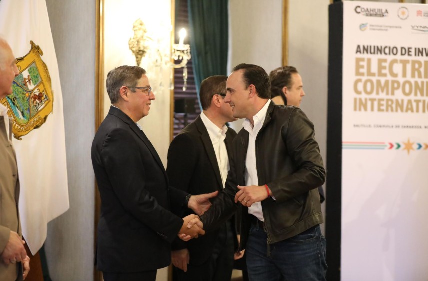 Saltillo, Coahuila.- Desde Palacio de Gobierno en Saltillo, el gobernador Manolo Jiménez Salinas, acompañado por Román Alberto Cepeda González, alcalde de Torreón; el secretario de Economía, Luis Olivares Martínez; la directora de Pro Coahuila, Sofía Delgadillo; y la Presidenta del Congreso, Luz Elena Morales, anunció la llegada de la empresa Electrical Components International, en donde reiteró que en Coahuila se trabaja con voluntad y en equipo por la seguridad y el desarrollo económico.